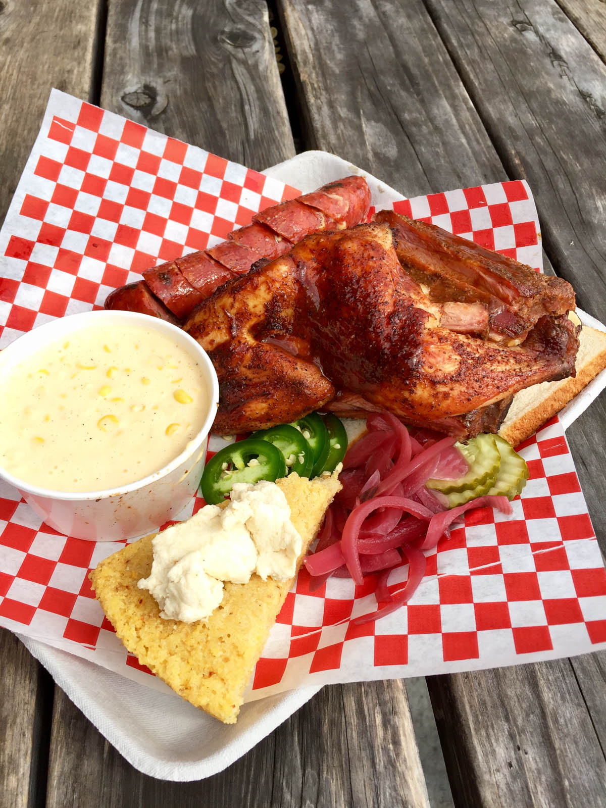 When my pager buzzed to signal my combo platter was ready, it was Foster who handed it to me. I’d ordered chicken, St. Louis ribs and sausage. All the meat was arranged atop halved slices of white bread. Next to them were sliced jalapeños, pickled onions, dill pickles, and the sides that I picked based on the bartender’s advice: Foster’s cornbread and cheesy corn. They were good choices.
