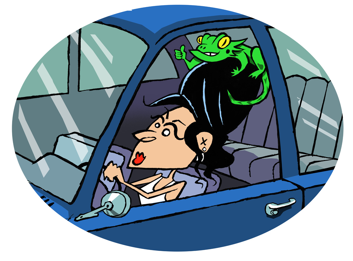 You were the lady with the Amy Winehouse bouffant driving a midnight-blue Rambler Classic down Coast Highway near Don the Beachcomber. I caught up next to you to see if you had thick eyeliner that disappeared into your black hair, and that’s when I saw it. A lizard was perched atop your magnificent ’do. Wonders never cease in this amazing, hideous world.