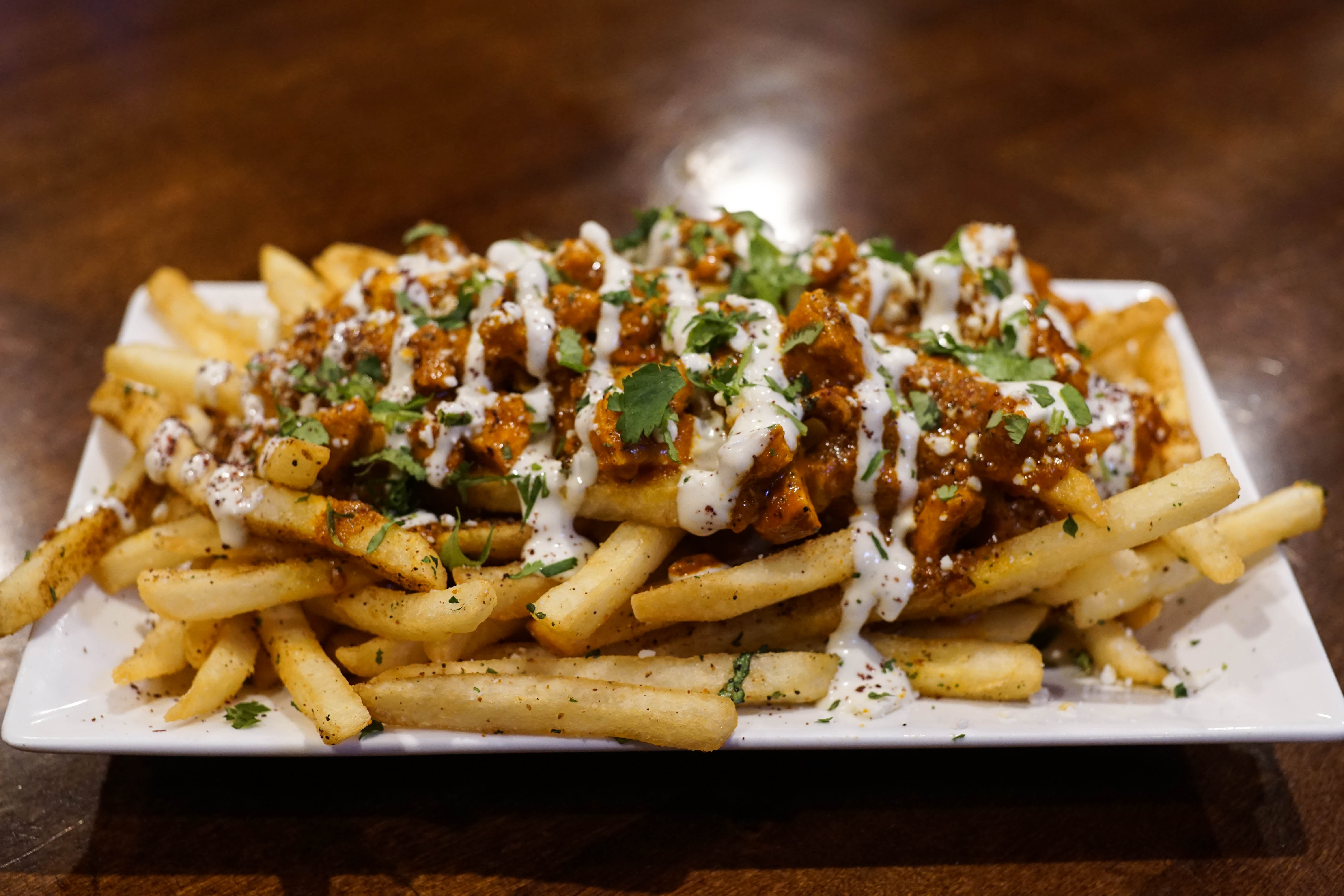A great starter is the chicken masala fries, golden, crisp French fries are topped in a sweet-and-spicy masala gravy, tender morsels of chicken and tangy crumbles of feta, then finished with a generous drizzle of creamy garlic sauce. Also great for sharing is the vegetarian appetizer platter, with paneer masala fries, samosa, hummus and garlic naan.
