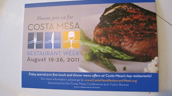 The first-ever Costa Mesa Restaurant Week is August 19-26, 2011! In conjunction with some of the finest Costa Mesa restaurants, this event will showcase the diversity of dining options in our city. Please your palate at participating restaurants with prix fixe menus of 3 or more courses at incredible prices. Prices start as low as $10.11 for lunch and just $19.11 for dinner. This very special week is an excellent opportunity to experience the cuisine of new restaurants and old favorites throughout Costa Mesa!