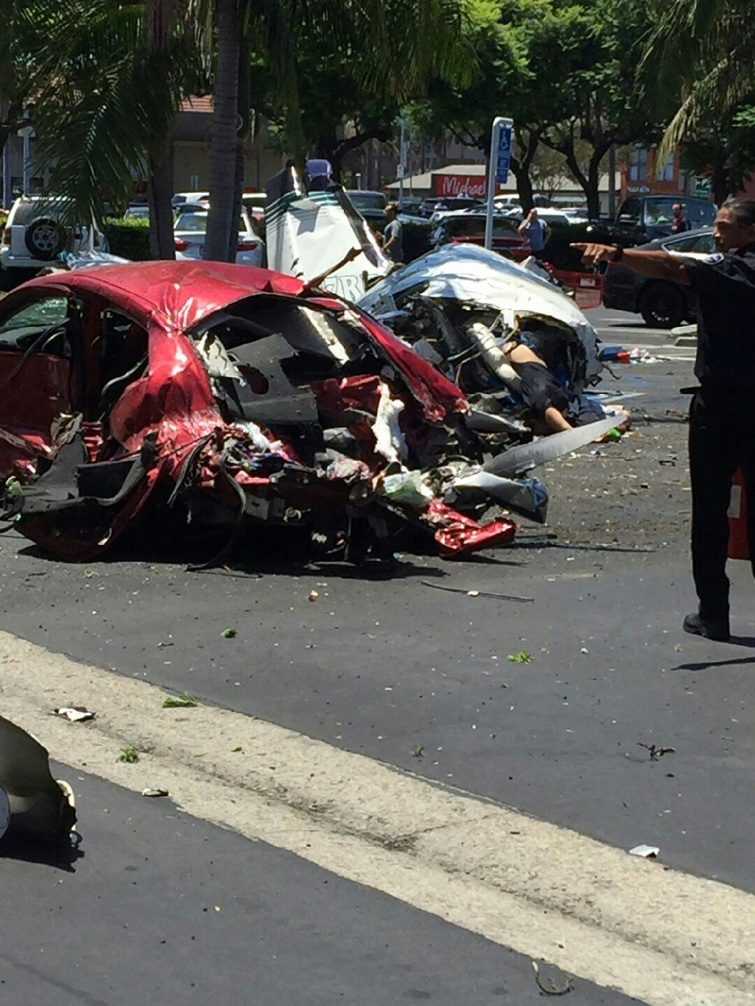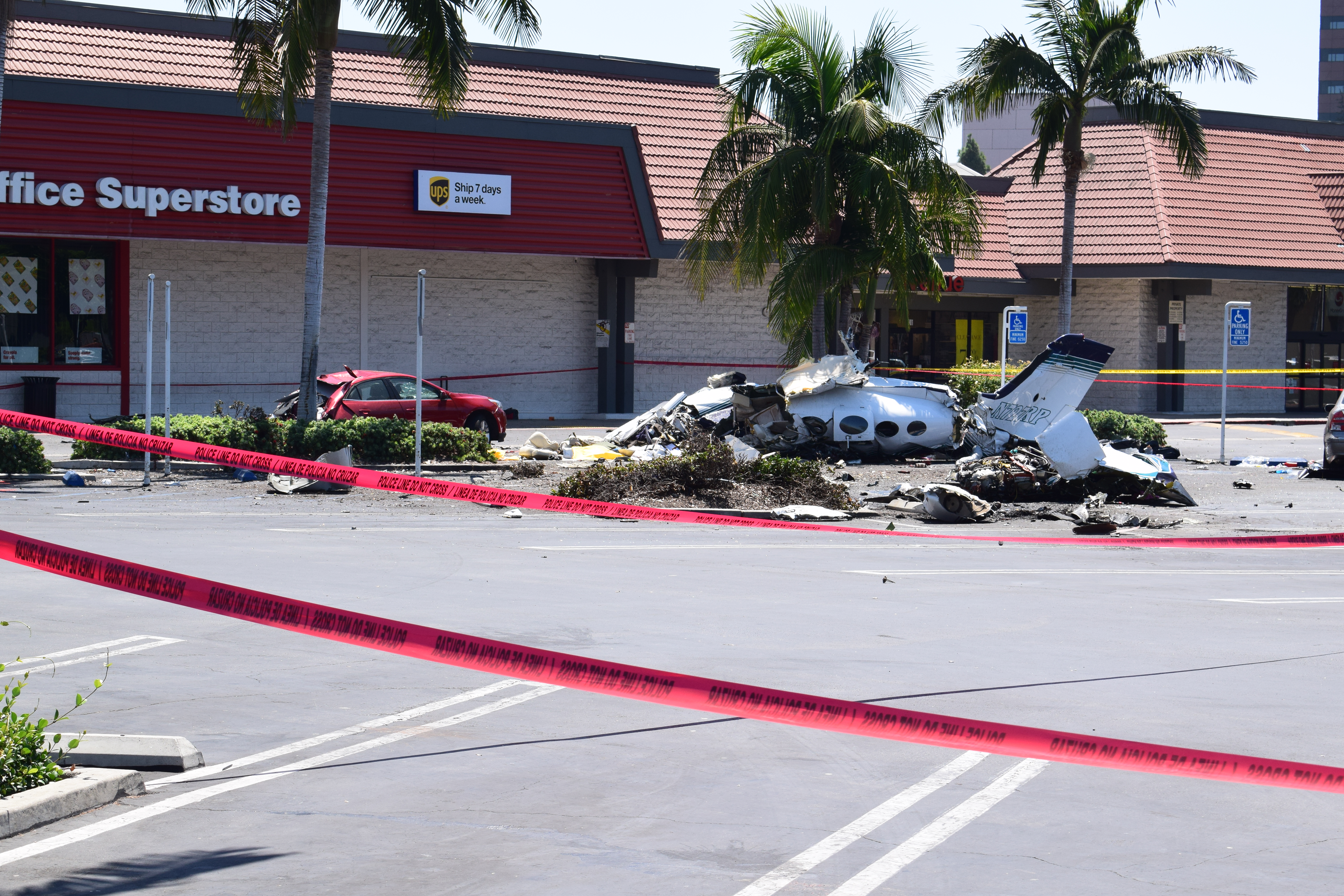 The sheared Cessna lay scattered across the asphalt. The rear of the red Chevrolet sedan hit by the plane was crushed. The car’s owner had parked minutes before the crash and was inside shopping at Staples, according to the Orange County Fire Authority (OCFA).